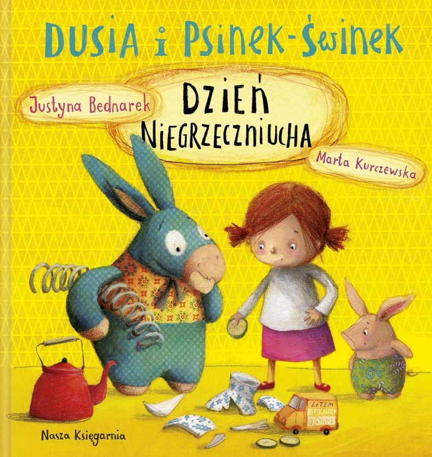 Dusia jest pewna, że dziś wypada Dzień Niegrzeczniucha! Tak po prostu musi być, bo nawet mama jest naburmuszona, a w domu pojawia się tajemniczy piegowaty rudzielec - wujek Kacper, który okropnie łobuzuje. Wypija Dusi jej ulubiony sok, chowa domownikom kapcie, a potem tłucze śliczny wazonik. Ale to jeszcze nie koniec - na ulicy jakiś pan w żółtej furgonetce wymyśla tatusiowi od osłów, a w przedszkolu Patryk nazywa Monikę kapuścianą pupą. Wszyscy sobie dokuczają, a już najbardziej mama i jej piegowaty kuzynek! Ale bez obaw! Psinek-Świnek i jego kolega Osioł Patentowany znajdą na to jakiś sposób!