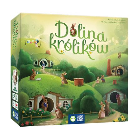 Dolina królików / Anna Sobich-Kamińska ; ilustracje Justyna Hołubowska-Chrząszczak. - Wydanie I. - Warszawa : Wydawnictwo Zielona Sowa, copyright 2019. - 1 gra (1 plansza, 51 kart królików, 16 kart domków, 9 kart lasu, 4 karty pomocy, znacznik pierwszego gracza, znacznik rundy, 8 znaczników pozycji, 9 kości, 12 znaczników graczy, 60 żetonów surowców) : karton, plastik, kolor ; w pudełku 8x26x26 cm + instrukcja ([12] stron : ilustracje kolorowe ; 25 cm).