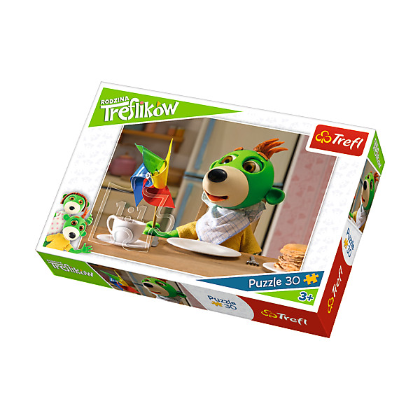 Puzzle rodzina Treflików to 30 elementowa układanka dla dzieci powyżej 3 roku życia. Po ułożeniu powstanie obrazek o wymiarach 27x20 cm.