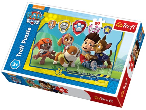 Psi Patrol : Ryder i przyjaciele. - Gdynia : Trefl, [2019]. - 30 puzzli : tektura, kolor ; w pudełku o wymiarach 21x14x4 cm.