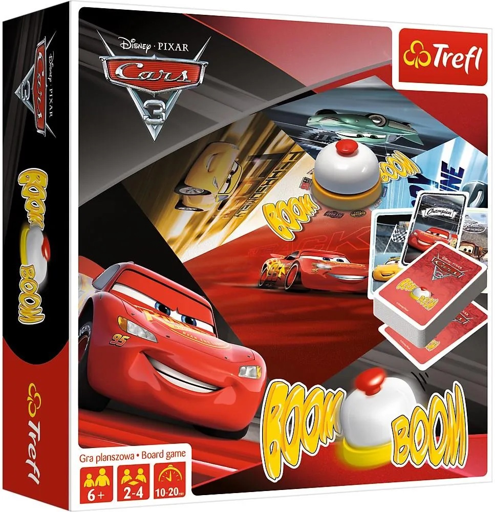 Bohaterowie filmu Auta 3 zapraszają do gry w Boom Boom! Zbierz komplet kart i zadzwoń dzwonkiem! Żeby zostać zwycięzcą, musisz ułożyć wszystkie swoje zestawy kart z bohaterami filmu. Przeciwnicy nie dadzą za wygraną. Boom Boom – zakręcona gra z dzwonkiem, w której wszyscy grają naraz! Kto pierwszy zakończy grę?