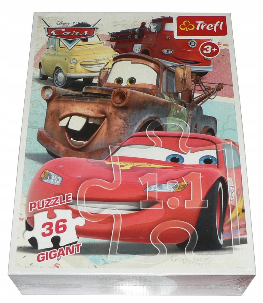 Cars - Disney Pixar : puzzle. - Gdynia : Trefl, [brak roku wydania]. - 36 puzzli (puzzle gigant) : karton, tektura, kolor ; w pudełku 8x23x31 cm.